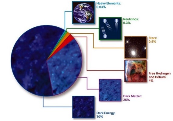 Lastly, in the last two decades, there have been overwhelming indications that dark matter contributes to the major part of Omega of the Universe. The above figure on the left shows the observed fraction of elements (in shaded red vertical bar) as a function of the baryon density. Compered to the critical density (the vertical black line), Omega baryon only counts for 4.6% to the total Omega. The right figure shows the combined results of three observations : CMB doppler peak, distant Supernovae, and the large scale structure, all indicating the striking facts: (1) The total Omega is critical (= 1.0) as predicted by the Inflation, (2) Omega_Matter = 0.27 and (3) Omega_Dark_Energy = 0.73. This means that there is a missing component in Omega_Matter = 0.27 - 0.046 ~ 0.23 that must be the Omega_Dark_Matter. The below figure illustrates the pie chart of the contribution of each component to the total Omega.