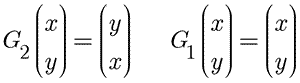 The altered scrutiny action number 2 (g=2) for this system is exchange x and y labels. Altered scrutiny number 1 (g=1) is, as before, no change in scrutiny. What the operations of the group Gg produce is summarized in the matrix equations below.